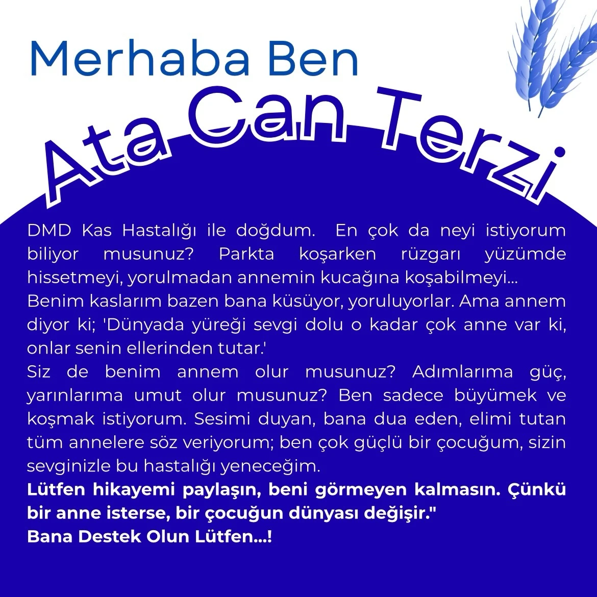 Merhaba, ben Atacan. Henüz küçücüğüm ama omuzlarımda büyük bir yük var: DMD Kas Hastalığı.